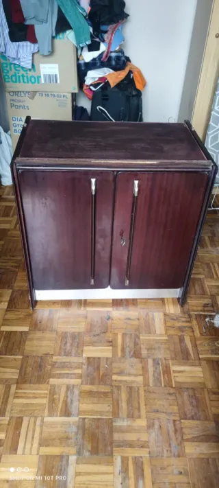 Mueble auxiliar con un diseño elegante y funcional en madera de cerezo. Ideal para añadir almacenamiento extra en cualquier estancia y para Tv. Con ruedas Venta en persona - Dos cajones superiores con tiradores decorativos. - Dos estantes abiertos para exhibición o almacenamiento. - Acabado en tono marrón cálido.