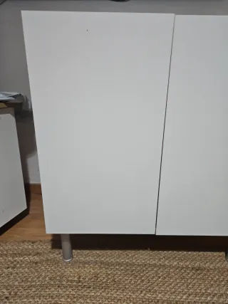 Mueble de televisión Besta de IKEA en acabado blanco. - Patas cónicas. - Puertas con tiradores integrados.