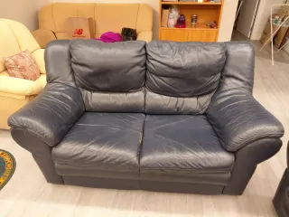 URGE!!! **Recogida: calle Edgar Neville, cerca de la Renfe de Nuevos Ministerios y metro Santiago Bernabéu*** TRANSPORTE A CARGO DEL COMPRADOR. Edificio con ascensor. Sofá de dos plazas de PIEL color azul marino. En buen estado general aunque con alguna parte desgastada, como se puede ver en las fotos. Medidas: 167x90x90 cm.