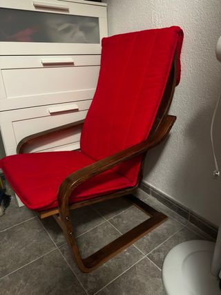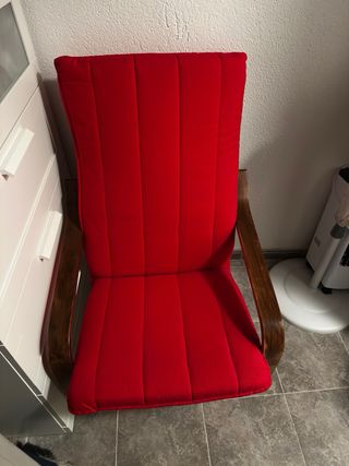 Mecedora con un diseño moderno y confortable. - Estructura de madera curvada. - Cojines acolchados en tela roja. Creo que es del ikea