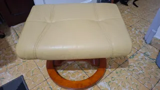 Estado: Muy bien cuidado, poco uso. Medidas: Largo 52 cm, Ancho 38 cm, Altura 38 cm. Material: Piel sintética de alta calidad (color crema/beige), muy fácil de limpiar. Estructura: Base circular de madera maciza, muy estable и decorativa. Uso: Ideal como reposapiés para sillón o como asiento auxiliar elegante. Diseño ergonómico y atemporal que combina con cualquier salón o despacho.