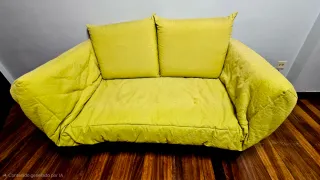Sofá cama de tela en un llamativo color amarillo. Es un mueble versátil que puede servir como asiento o como cama. - Dos cojines grandes incluidos. - Diseño moderno y cómodo.