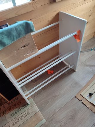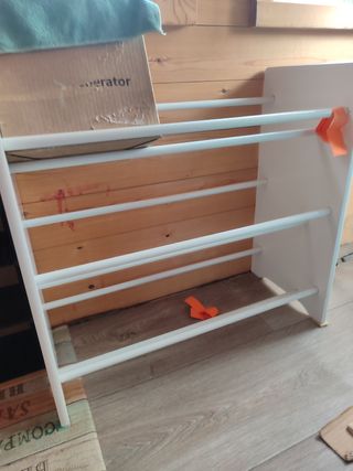 Zapatero. Estructura expositora de diseño moderno, ideal para organizar y mostrar calzado. - Estructura de metal blanco. - Barras de plástico. - Detalles en naranja. También vale para ordenar juguetes como tocando cajas sobre ello.