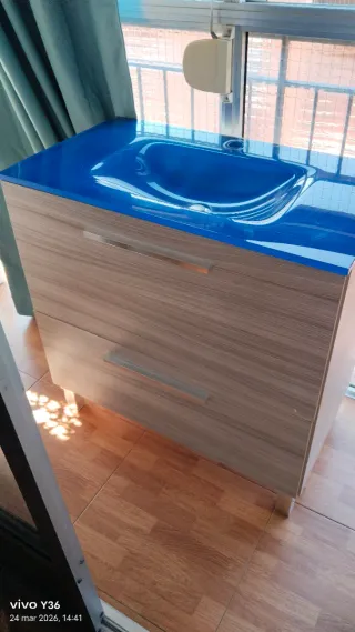Lavamanos con mueble de dos cajones. El lavamanos tiene un diseño moderno y el mueble está fabricado con un acabado que imita la madera. - Lavamanos de cristal azul. - Mueble de madera con dos cajones. - Medidas del mueble: 46 cm de largo y 80 cm de alto.