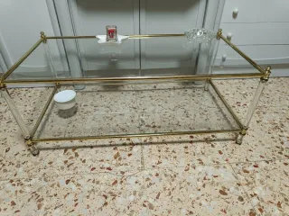 Elegante mesa de centro con estructura de metal dorado y patas de metacrilato. Sus superficies de cristal ofrecen un diseño moderno y luminoso. - Diseño de dos niveles. - Acabado brillante en el metal.