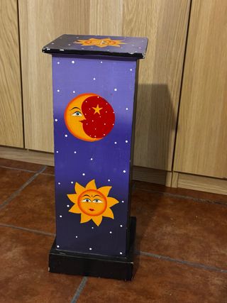 Mueble decorativo con un diseño único. Ideal para añadir un toque artístico a tu hogar. - Pintura a mano con motivos de luna, sol y estrellas. - Base negra. - Acabado multicolor y morado.