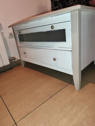 Mueble de televisión con un diseño moderno y funcional. - Encimera de madera clara. - Cuerpo blanco con cajones y compartimentos. - Patas de madera. No envio. Es necesario recoger (esta sin desmontar pero cabe montado en el ascensor)