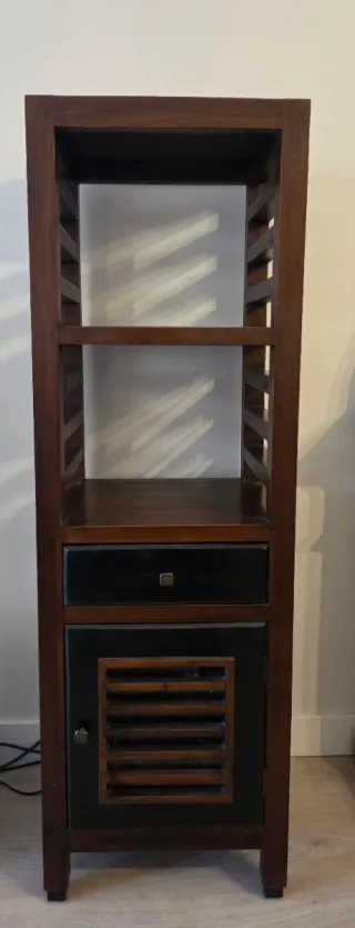 Mueble de almacenamiento con un diseño elegante y funcional. - Estructura de madera en tonos marrón y negro. - Cuenta con estantes abiertos. - Incluye un cajón. - Puerta inferior con diseño de lamas.