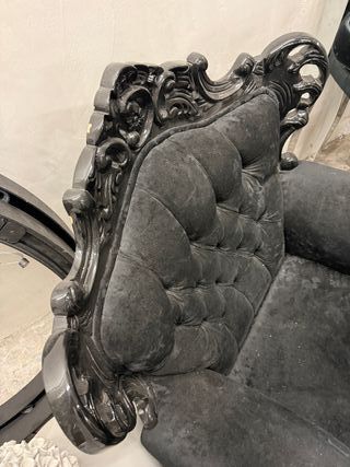 Elegante sillón de estilo antiguo con un acabado en terciopelo negro. Su diseño clásico y detallado lo convierte en una pieza destacada. - Estructura de madera tallada. - Tapicería de terciopelo suave. - Respaldo capitoné con botones.