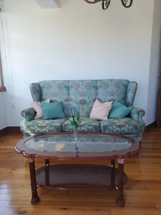 Elegante conjunto de salón de estilo antiguo, perfecto para dar un toque clásico a tu hogar. Incluye sofá y dos sillones. - Tapicería con estampado floral en tonos verdes y rosados. - Sofá de tres plazas. - Dos sillones individuales a juego. - Mesa de centro de madera