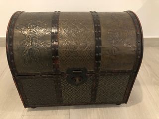 Este baúl antiguo aporta un toque clásico a cualquier espacio. Su diseño combina la calidez de la madera con detalles metálicos. - Acabado en tonos marrones y dorados. - Construcción robusta.