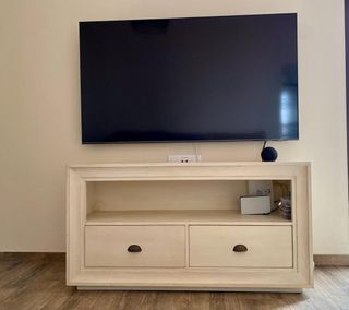 Mueble TV madera con dos cajones cajones, lacado blanco antiguo. Medidas 1,30x42x68