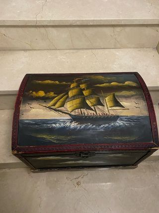 Baúl antiguo con una pintura detallada de un barco navegando en alta mar. La tapa curva añade un toque clásico. - Pintura de barco de vela. - Tapa curva. - Bordes decorados.