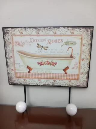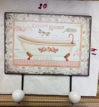 Percha decorativa con un diseño vintage de Dozen Roses y una bañera antigua. Ideal para añadir un toque de encanto a tu baño. Medidas en la foto - Ilustración con rosas y libélula. - Detalle de número 162. - Base con ganchos para colgar.