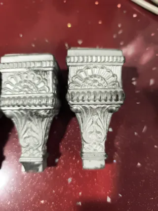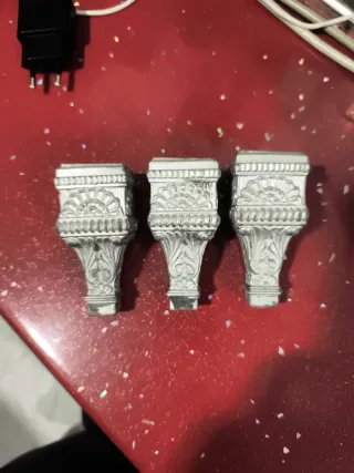 Conjunto de tres patas de cama antiguas con un diseño ornamental. Ideal para restauradores o proyectos Las tres 15e - Acabado plateado. - Fabricadas en metal.