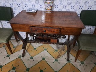 Elegante mesa antigua con un diseño clásico y funcional. Perfecta para añadir un toque de distinción a tu hogar. - Fabricada en madera de calidad. - Cuenta con un práctico cajón. - Patas con un diseño curvo y decorativo. - Detalle de ornamentación tallada en la parte inferior.