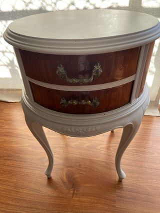 Mesita de noche antigua con un diseño clásico y elegante. Ideal para añadir un toque vintage a tu hogar. - Estructura principal de madera con detalles en marquetería. - Tiradores ornamentales dorados. - Patas curvas con ornamentación. - Requiere restauración.