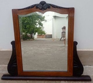 espejo de pared antiguo puedo testificar con datos y fechas familiares que oscila entre los 82-85 años de antigüedad el marco mide en total 76 cms. de alto x 87 cms. de ancho y sólo el espejo mide 58 cms. de alto x 43 cms. de ancho muy bien conservado