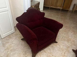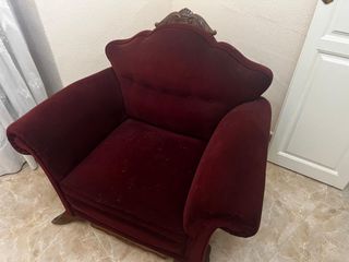 Conjunto de mobiliario antiguo para sala de estar. - Sofá de tres plazas. - Dos sillones individuales. - Tapicería de tela terciopelo. - Estructura de madera. - Ideal para amantes de la restauración de muebles antiguos - Medidas aproximadas, no lo he medido