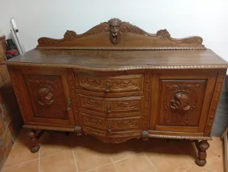 Mueble artesanal antiguo de castaño con un diseño tallado muy detallado. Altura 100cm mas 30cm del detalle superior. Ancho 175cm. Profundidad 48cm. Se encuentra en Villafranca de los Barros pero hay posibilidad de transporte a pueblo cercano bajo acuerdo económico. - Talla de rostro humano en el frontal superior. - Puertas laterales con relieves de rostros. - Cajones centrales con tiradores dorados. - Patas torneadas y decoradas.