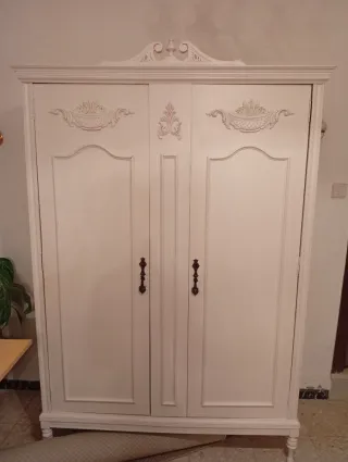 Precioso armario antiguo de madera con dos puertas y detalles decorativos. - Acabado en color beige y blanco. - Diseño clásico y elegante. - Dispone de 3 cajones en una de las puertas y espejo (algo roto) en la otra - Ideal para restauradores de muebles antiguos