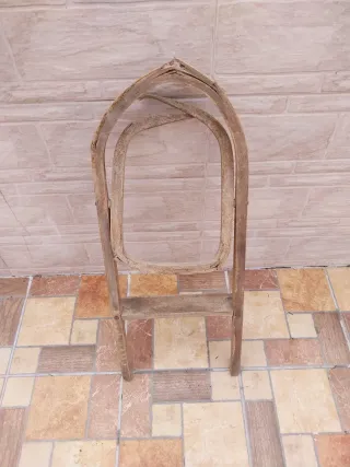 Este es un soporte de espejo antiguo, con un diseño curvo y ovalado. - Fabricado en madera. - Color beige y marrón.