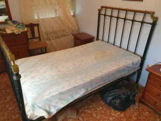 Cama antigua de forja, ideal para dormitorio de soltero. Está en buen estado con somier de muelles solo necesita abrillantado del bronce. La cama es original tiene más de 100 años de antigüedad, sus medidas totales 195cm por 123cm para largo de colchón de 180cm. A recoger en zona corazón de Jesús. No se envía ni se negocia.