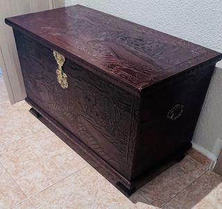 Este baúl antiguo presenta un diseño tallado con escenas. - Cerradura dorada. - Base con patas.