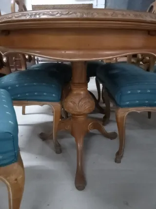 Conjunto de comedor antiguo con un diseño clásico y elegante. - Mesa de comedor con superficie de madera veteada. - Sillas tapizadas en tela azul. - Patas y estructura de las sillas de madera tallada. Mesa de comedor con alas ampliable para 8 comensales 6 sillas incluidas Madera en perfecto estado de conservación