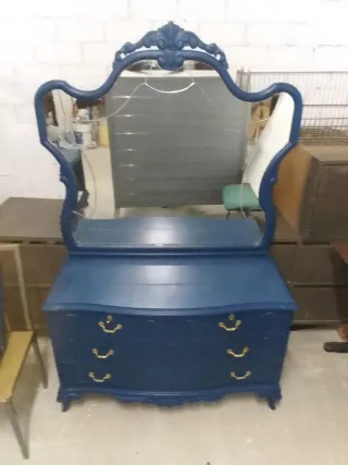 Preciosa cómoda antigua que ha sido restaurada con un acabado en azul y detalles dorados. Su diseño clásico le da un toque elegante a cualquier espacio. - Estructura de madera. - Espejo con marco decorativo. Medidas son el espejo Medidas del espejo Alto:106 Ancho: 102