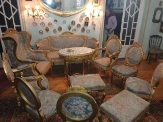 Conjunto de salón de estilo Luis XV con acabados dorados y tapicería. - Sofá de tres plazas. - Dos sillones individuales. - Mesa auxiliar redonda. - Dos otomanas. - Estructura de madera tallada. - Tapicería con diseño floral. -mesa de entrada con espejo