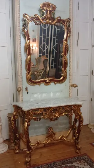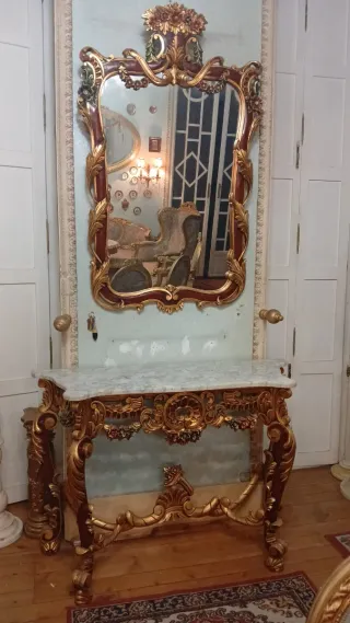 Elegante recibidor de estilo antiguo, con una combinación de materiales que aportan distinción. - Encimera de mármol. - Estructura de madera tallada. - Detalles dorados ornamentales.