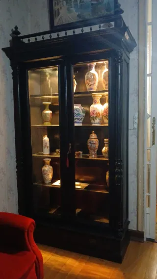 Elegante vitrina antigua con puertas de cristal y detalles decorativos. - Estructura principal de madera oscura. - Puertas con paneles de cristal. - Exhibe varios jarrones y objetos decorativos. De los años 20 o 30