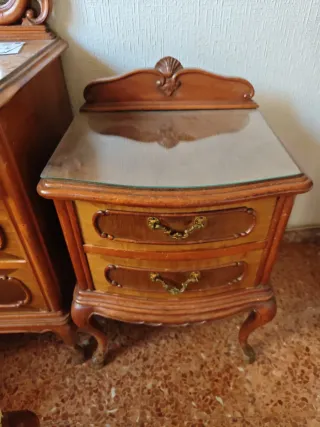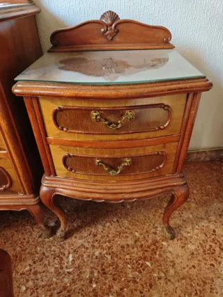 Elegante mesita de noche de estilo antiguo, perfecta para añadir un toque clásico a tu dormitorio. - Diseño con dos cajones. - Encimera de cristal. - Patas curvas con detalle. - Tiradores dorados ornamentados. **** SE VENDE POR SEPARADO O CONJUNTAMENT CON OTROS MUEBLES DE MI PERFIL*****