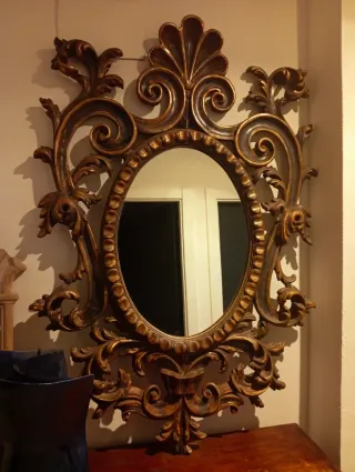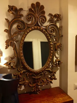 Elegante espejo cornucopia antiguo, italiano con marco de madera tallada y detalles dorados. - Diseño de cornucopia. - Marco con ornamentación. - Forma ovalada del espejo.