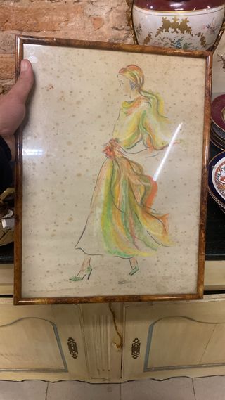 Este es un dibujo original de una figura femenina con un vestido de moda. - Marco de madera con detalles. - Dibujo sobre papel con manchas.