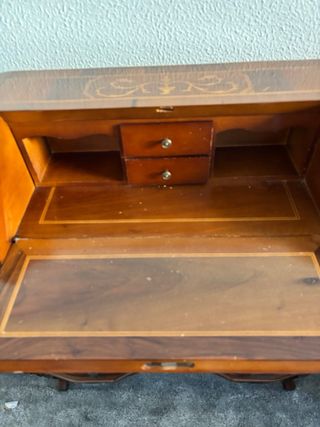 Elegante mueble buró secreter (cómoda-secreter) con detalles dorados y acabados en madera, de estilo barroco o Luis XV italiano, caracterizado por su forma curva o "bombé" y su marquetería floral o de pergamino. - Diseño antiguo y clásico. - Tres cajones amplios. - Compartimento secreto. - Patas curvas de estilo. - Incrustaciones decorativas. En la foto? La tabla que se baja dale clara pero es del reflejo de la luz.