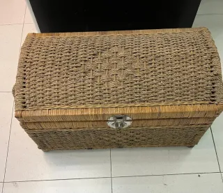 Baúl antiguo con un encantador estilo rústico vintage. Ideal para añadir un toque de carácter a cualquier espacio. - Elaborado con mimbre de alta calidad. - Diseño de baúl con tapa. - Acabado en tonos beige y marrón. - 65x35x34 cms - Presenta un asa con el trenzado para reparar y una de las cadenas interiores suelta, fáciles de reparar. Desperfectos que se han tenido en cuenta en el precio. Ver fotos