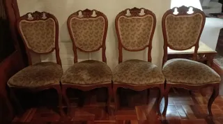 Conjunto de sillas de madera con un diseño clásico y elegante. - Estructura robusta de madera. - Respaldo tallado con detalles ornamentales. - Patas curvas con un estilo tradicional. -Faltan los cojines donde sentarse. tendrás que encargar que te hagan nuevos. Cada silla 35 € y tengo 6 Uds. todas por 180 €.