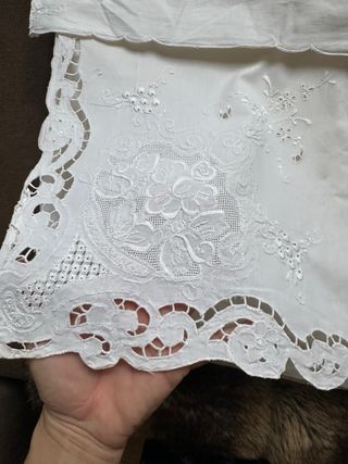 Preciosas sábanas antiguas con un delicado bordado a mano. - Diseño floral intrincado. - Acabado con puntilla. - Tejido de algodón de alta calidad. Una es bajera y encimera. Otra es sabana con dos alhmohadas