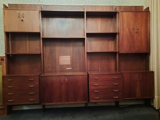 Mueble Salón de madera Color nogal con un diseño modular y múltiples baldas Mueble de 4 módulos con trasera. Todos con Balda superior 4 Cuerpos inferiores Alto 50 cm 2 Cuerpos superiores con 2 puertas con llave forrada en cuero: Alto 40 cm/80 cm Ancho de izda. a dcha.: 60 cm/80 cm/60 cm/60 cm Fondo de izda. a dcha.: 35 cm/42 cm/42 cm/35 cm Módulo-2: Cuerpo con 1 Balda interior Módulo-4: Cuerpo superior con 3 Baldas interiores de cristal/Cuerpo inferior con 1 Balda interior de cristal Cuerpos inferiores con múltiples rayones y algún tirador cuero deteriorado 2 Agujeros en trasera de antigua TV de tubo Comprador: Desmontaje y embalaje