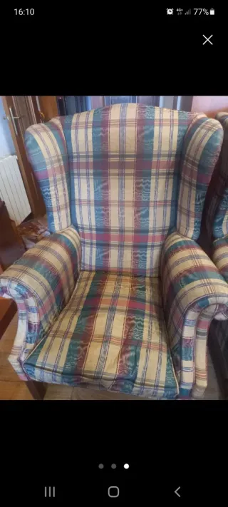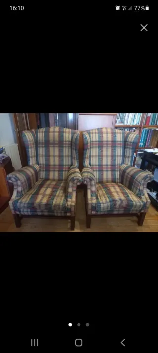 -Par de sillones orejeros antiguos en perfecto estado. -Tapizados en tela con un diseño clásico. - Diseño de orejas pronunciadas. - Patas de madera oscura. -Cada sofa 50€ . -Los 2 juntos 90€.