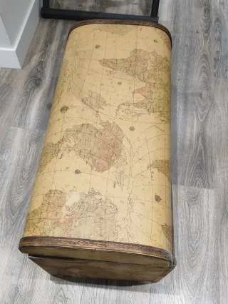 Baúl con diseño de mapa del mundo, ideal para proyectos de restauración. Su forma rectangular y acabados le dan un toque vintage. - Diseño de mapa del mundo. - Bordes decorativos. - Estructura robusta. - 81x37 aprox VENTA EN MANO