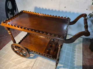 Elegante mesa bar de madera con un diseño antiguo y detalles decorativos. - Bandeja superior con borde festoneado. - Bandeja inferior con soporte para botellas. - Ruedas decorativas estilo antiguo.