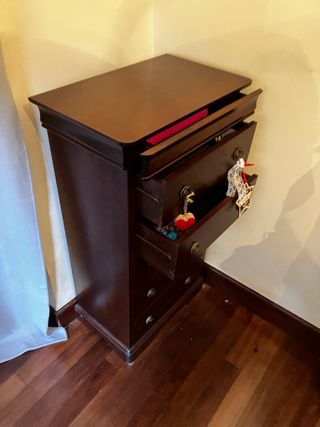 Cómoda antigua con un diseño elegante y funcional. ❗️Tengo también las mesitas a juego, lo podría vender junto a un precio rebajado. - Tres cajones amplios para almacenamiento. - Acabado en madera oscura. - Encimera de cristal.