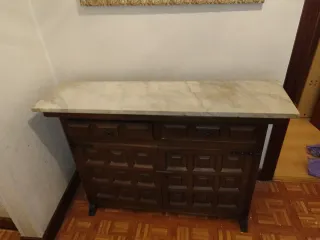 Mueble recibidor de estilo antiguo con una combinación de materiales. - Encimera de mármol. - Cuerpo principal de madera. - Dos cajones superiores con tiradores. - Puertas inferiores con diseño tallado. - Bisagras y tiradores metálicos. Medidas:120x82x33