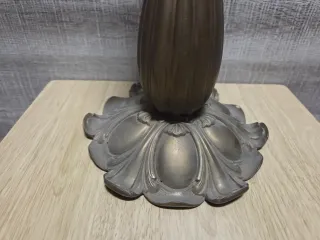 Elegante candelabro antiguo con un diseño intrincado. - Base ancha y decorada. - Cuerpo torneado. - Parte superior con soporte para vela. Metal : latón