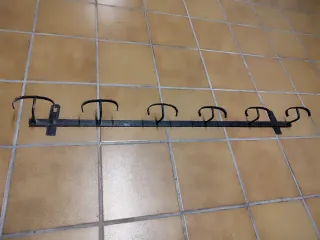 Colgador de pared antiguo con un diseño rústico. - Fabricado en hierro. - Color negro. - Consta de 6 ganchos. - Medidas: 112×9×12.