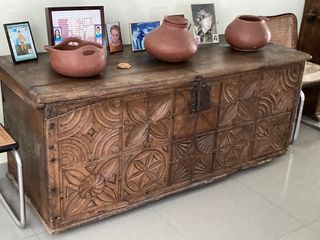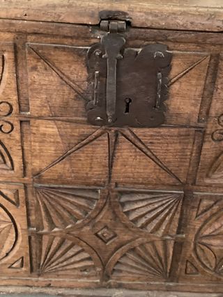 Arcón antiguo, del siglo XVIII, de madera labrada, está en Leioa, Bizkaia.