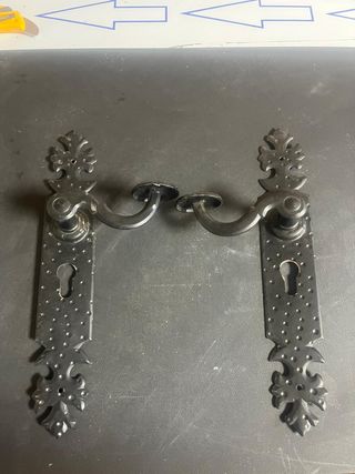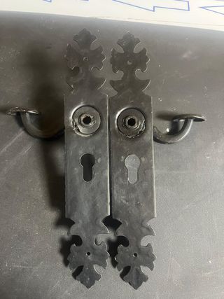 Juego de manillas antiguas de hierro forjado, ideales para puertas de madera en casas rurales, restauraciones o decoración rústica. 🔹 Material: hierro/acero forjado 🔹 Incluye: 2 manillas + bocallaves 🔹 Estilo rústico / tradicional 🔹 Muy robustas, pesadas y de buena calidad 🔹 Perfectas para puertas interiores o exteriores 📌 Estado: usadas, con marcas del tiempo normales (ver fotos) 📌 No son reproducciones ligeras modernas